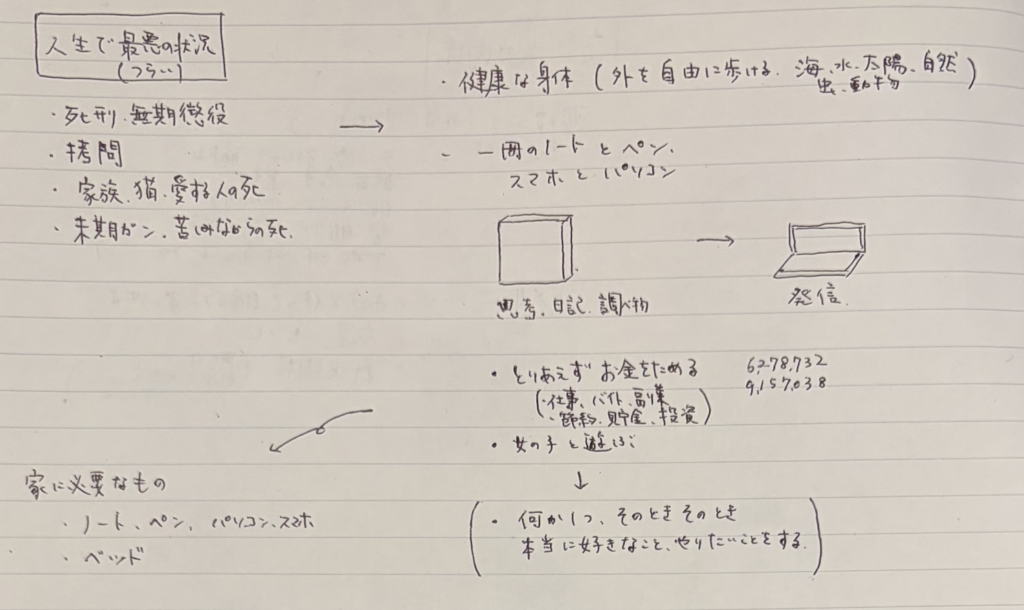 僕が考える最悪の状況は、死刑と無期懲役、拷問、家族や愛する人の死、末期ガンなどの治る見込みのない状況で苦しみながら死を待つだけの状況など。
